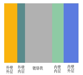 用于制罐的覆膜鐵其結構有內壁和外壁之分,內外壁覆膜均有兩層。內壁外層起到阻遏作用,內壁內層起到與鍍鉻鐵黏合及防腐蝕的作用;外壁外層起到防劃傷以及便于印刷等作用,外壁內層起到與鍍鉻鐵黏合的作用。