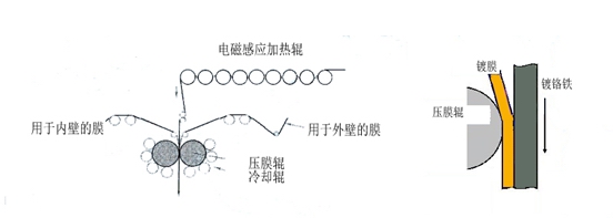 覆膜鐵的生產線主要由鍍鉻鐵開卷部分、焊接及鐵表觀質量檢測、基板加熱、覆膜單元、冷卻單元、產品檢測及涂油卷取等部分組成,其中最核心的部分為基板的加熱區域和覆膜單元。通過電磁感應加熱輥預熱部分加熱鋼帶至膜的熔點以上溫度,用對稱的兩個壓力膠輥的擠壓進行基板與膜的熱熔貼合。熱貼后的鋼帶通過冷卻裝置進行快速冷卻,以確保熔融后的高分子迅速重新結晶。